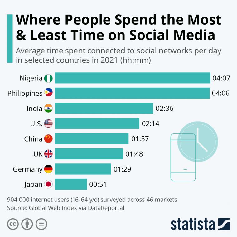 Οι Φιλιππινέζοι ξόδευαν συνήθως σχεδόν τον ίδιο χρόνο την ημέρα στους ιστότοπους κοινωνικής δικτύωσης, ενώ οι Ινδοί και οι Κινέζοι αφιέρωναν περίπου 2,5 ώρες και 2 ώρες, αντίστοιχα, την ημέρα.