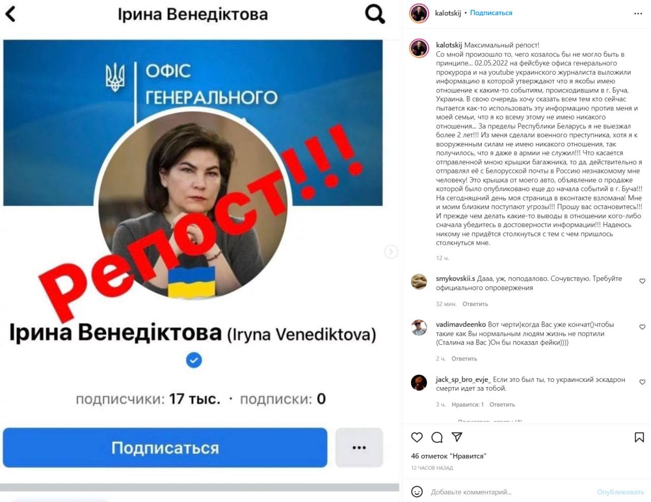 "... Ναι, πράγματι, το έστειλα από το ταχυδρομείο της Λευκορωσίας στη Ρωσική Ομοσπονδία. Αυτό είναι ένα εξώφυλλο από το αυτοκίνητό μου, η ανακοίνωση της πώλησης του οποίου δημοσιεύτηκε πριν από τα γεγονότα στη Μπούσα", πρόσθεσε ο Kolotsey, λέγοντας ότι ο ίδιος και η οικογένειά του είχαν ήδη απειλές έρχονται.