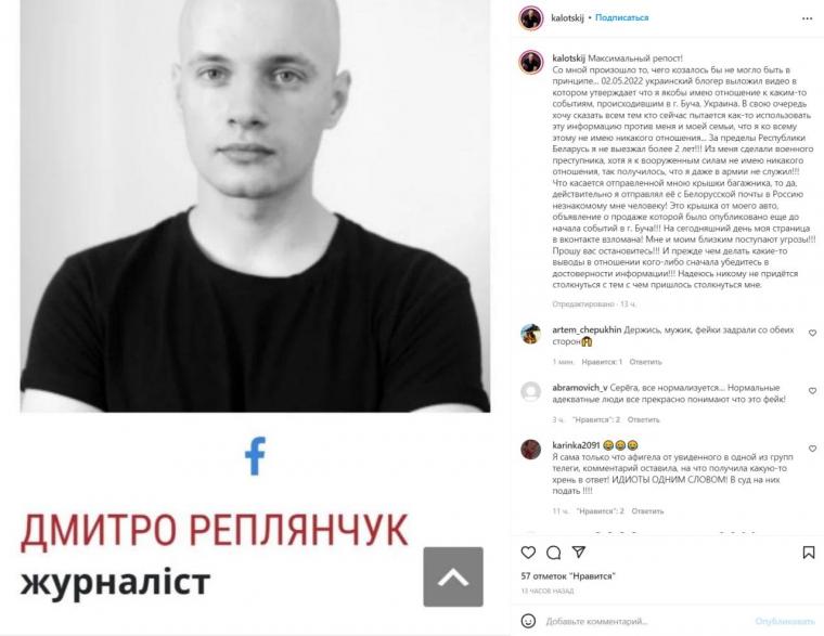 ''Μου συνέβη κάτι το αδιανόητο, στις 2 Μαΐου του 2022, ένας Ουκρανός blogger δημοσίευσε ένα βίντεο στο οποίο ισχυρίζεται ότι είχα σχέση με κάποια γεγονότα που έλαβαν χώρα στην πόλη Μπούσα της Ουκρανίας. Με την σειρά μου και εγώ θέλω να πω σε όλους εκείνους που τώρα προσπαθούν να χρησιμοποιήσουν με κάποιο τρόπο αυτές τις πληροφορίες εναντίον μου και εναντίον της οικογένειάς μου, ότι δεν έχω καμία σχέση με όλα αυτά... Δεν έχω ταξιδέψει εκτός της Δημοκρατίας της Λευκορωσίας για περισσότερα από δύο χρόνια! Εγώ εγκληματίας πολέμου, αν και ανήκω στις ένοπλες δυνάμεις, δεν έχω καμία σχέση με αυτό. Πως συνέβη, αφού δεν υπηρέτησα καν στο στρατό'', έγραψε ο Kolotsey.