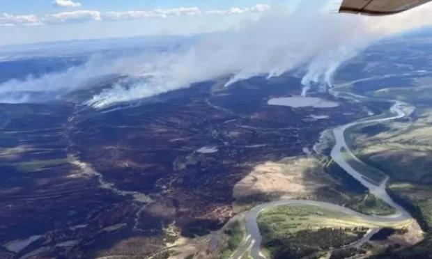 Η φωτιά δεν απειλεί κατοικημένες περιοχές, ωστόσο η οικολογική καταστροφή είναι τεράστια, όπως φαίνεται και από τις φωτογραφίες που τράβηξε από αεροπλάνο η πυροσβεστική υπηρεσία.
