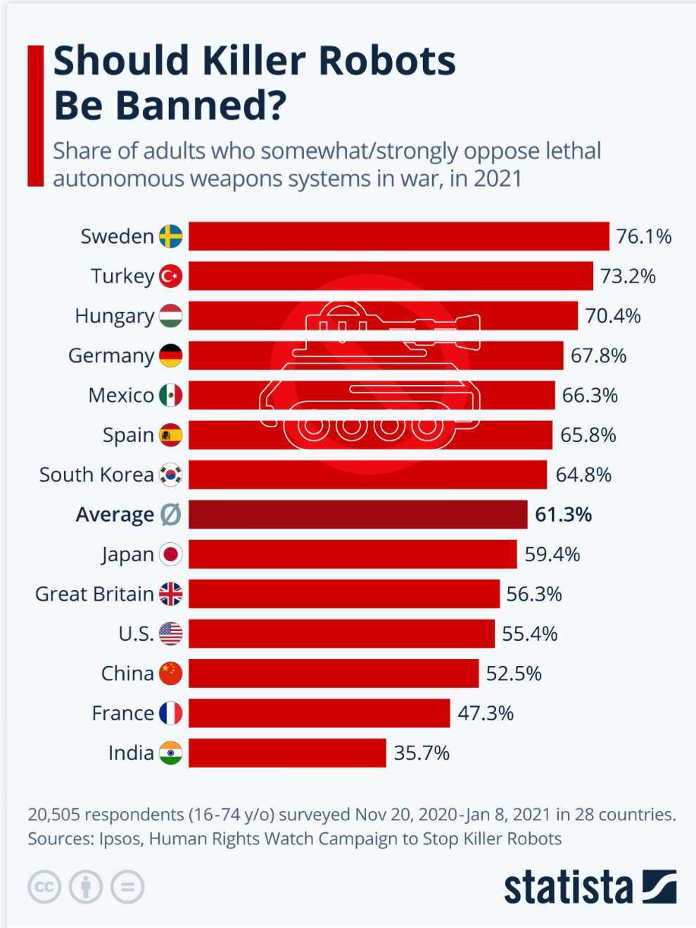 Η μεγάλη πλειοψηφία του κόσμου εξακολουθεί να επικρίνει τα θανατηφόρα αυτόνομα οπλικά συστήματα στον πόλεμο, σύμφωνα με έρευνα που πραγματοποιήθηκε από την Ipsos και την Campaign to Stop Killer Robots. Από τις 28 χώρες που συμμετείχαν στην έρευνα μεταξύ 20 Νοεμβρίου 2020 και 8 Ιανουαρίου 2021, όλες εκτός από μία ήταν κατά κύριο λόγο κατά της χρήσης τους.
