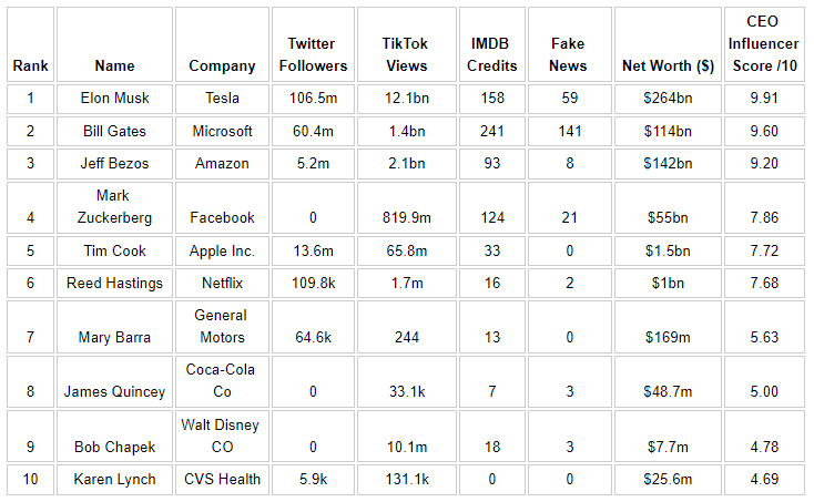 Ο Έλον Μασκ στέφθηκε ως ο CEO με τη μεγαλύτερη επιρροή με σχεδόν τέλεια βαθμολογία 9,91 στα 10. Ο Μασκ έχει εκπληκτικό αριθμό προβολών TikTok (12,1 δισεκατομμύρια), δείχνοντας πόσο μεγάλη επιρροή έχει, ειδικά στη νεότερη γενιά.