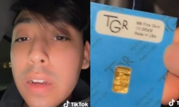 Δείχνοντας στην κάμερα την κάρτα που περιείχε ένα μικρό κομμάτι χρυσού, αποκάλυψε ότι ήταν… «ένα τρίτο γραμμάριο χρυσού» και το περιέγραψε ως ένα cool χριστουγεννιάτικο δώρο».