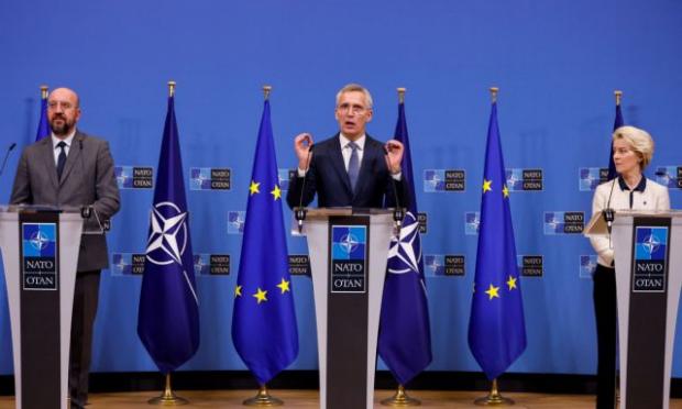 Η ΕΕ και το ΝΑΤΟ δεσμεύτηκαν σήμερα να παράσχουν στην Ουκρανία όλα τα στρατιωτικά μέσα που είναι απαραίτητα για να υπερασπιστεί το δικαίωμά της στην αυτοάμυνα, τόνισαν ο Γ.Γ. του ΝΑΤΟ, Γενς Στόλτενμπεργκ, η Πρόεδρος της Επιτροπής, Ούρσουλα φον ντερ Λάιεν και ο Πρόεδρος του Ευρωπαϊκού Συμβουλίου, Σαρλ Μισέλ, κατά τη διάρκεια κοινής συνέντευξης Τύπου.