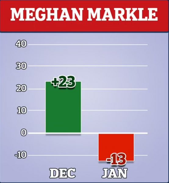 Κάτι αντίστοιχο συμβαίνει και με τη Μέγκαν Μαρκλ που είδε επίσης τη φήμη της να πλήττεται από το ongoing δράμα. Η δημοτικότητά της βρίσκεται πλέον στο -13 συγκριτικά με το +23 στις 5 Δεκεμβρίου.