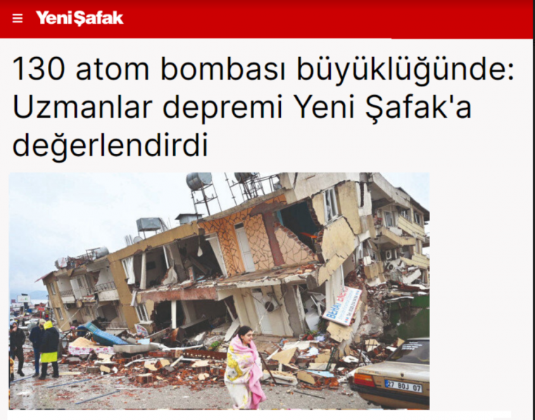 Για σεισμό μεγέθους «130 ατομικών βομβών» κάνει λόγο δημοσίευμα της τουρκικής φιλοκυβερνητικής εφημερίδας Yeni Safak, παρουσιάζοντας απόψεις ειδικών, για τον φονικό εγκέλαδο που έπληξε την κεντρική, νότια και ανατολική χώρα καθώς και τη βόρεια Συρία.