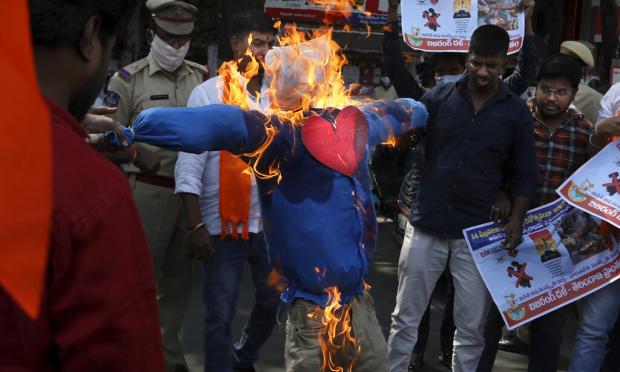 Στην Ινδία, ακραίοι Ινδουιστές εθνικιστές διαμαρτυρήθηκαν για τον εορτασμό της ημέρας του Αγίου Βαλεντίνου και απείλησαν όσους τη γιορτάζουν.