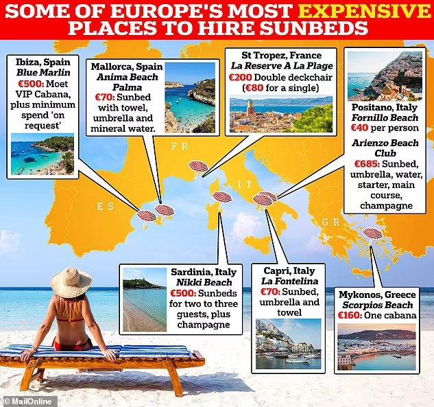 »Το Anima Beach Palma στη Μαγιόρκα της Ισπανίας χρεώνει 70 ευρώ για μια ξαπλώστρα, ομπρέλα και πετσέτα. Και το Blue Marlin στην Ίμπιζα της Ισπανίας χρεώνει 30 ευρώ για μια ξαπλώστρα, αλλά υπάρχει επίσης ελάχιστη δαπάνη στο χώρο 50 ευρώ ανά κρεβάτι. Εν τω μεταξύ, μια “Moet VIP Cabana” στο θέρετρο κοστίζει 500 ευρώ, συν μια ελάχιστη δαπάνη “κατόπιν αιτήματος”».