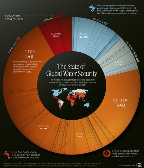 Όπως απεικονίζει παρακάτω ο Freny Fernandes του Visual Capitalist, μια πρόσφατη έκθεση του Πανεπιστημίου των Ηνωμένων Εθνών για την παγκόσμια ασφάλεια του νερού αξιολόγησε την ασφάλεια του νερού σε διάφορες χώρες του κόσμου.