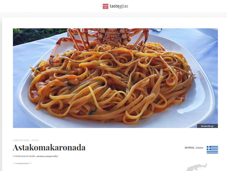 Στη θέση 35 είναι η δημοφιλής, ειδικά στα νησιά, αστακομακαρονάδα με το Taste Atlas να γράφει: «Το κύριο στοιχείο σε αυτό το εξαιρετικό ελληνικό πιάτο είναι ο αστακός που συνδυάζεται με μια γευστική σάλτσα ντομάτας και σερβίρεται πάνω σε ζυμαρικά. Το πιάτο συνήθως παρασκευάζεται με σπαγγέτι, ενώ η σάλτσα συνήθως εμπλουτίζεται με κρασί και διάφορα βότανα και μπαχαρικά. Το κρέας του αστακού σερβίρεται παραδοσιακά σε κέλυφος, ενώ όλο το πιάτο γαρνίρεται γενναιόδωρα με μαϊντανό. Αν και μπορεί να βρεθεί και σε άλλες ελληνικές περιοχές, η αστακομακαρονάδα συνδέεται κυρίως με το νησί της Σκύρου».