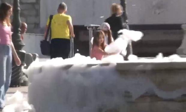 Όπως ανέφερε ο δημοσιογράφος της ΕΡΤ, Αλέξανδρος Μέμος, που βρέθηκε στο σημείο για να καλύψει τον πρόωρο στολισμό της πλατείας με χριστουγεννιατικη διακόσμηση, προφανώς κάποιοι νεαροί έριξαν καθαριστικό πιάτων ή αφρόλουτρο στο δημοφιλές συντριβάνι.