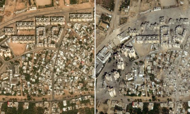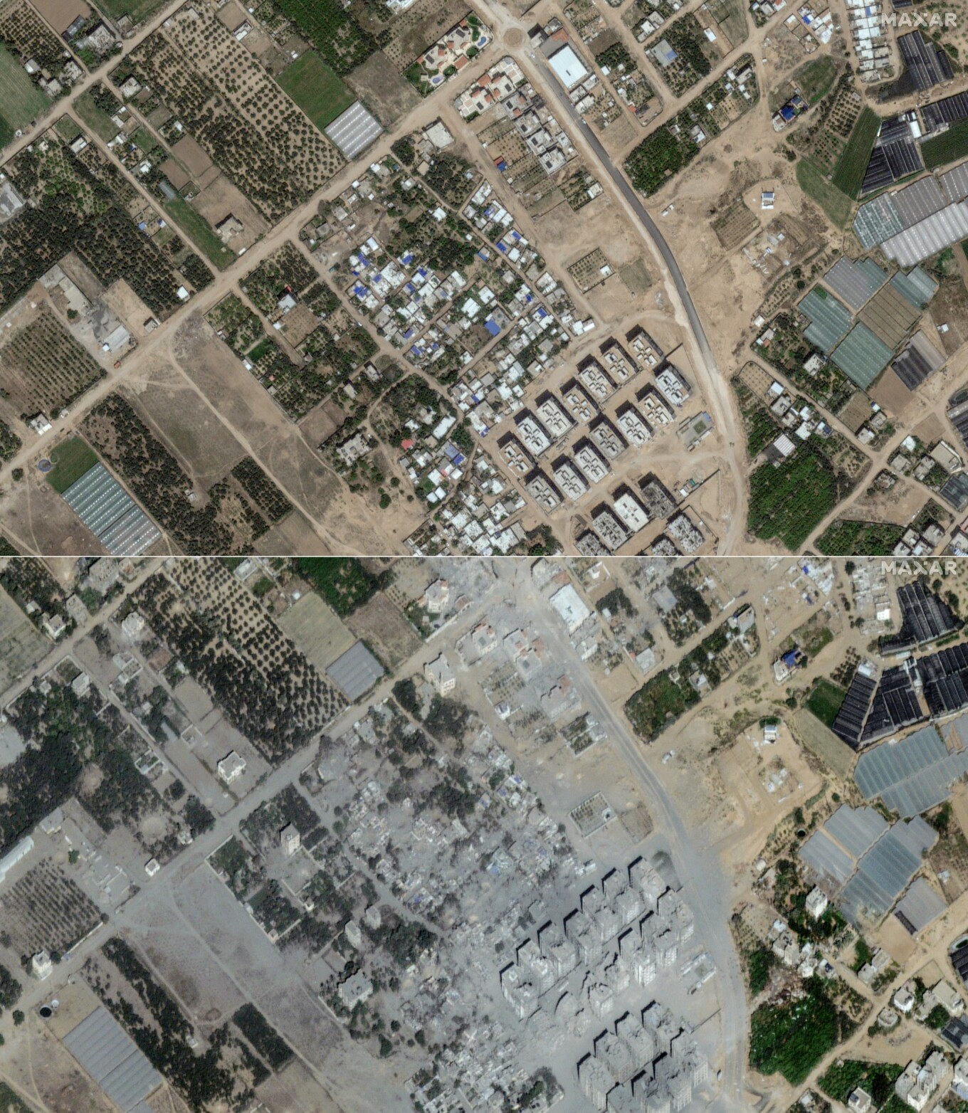 Όπως φαίνεται και στις φωτογραφίες, κτίρια, σπίτια και δομές έχουν μετατραπεί σε ερείπια και τίποτα δεν θυμίζει πια τις περιοχές της Λωρίδας της Γάζας, λίγες ώρες μετά τη βραδινή επιδρομή του ισραηλινού στρατού στο βόρειο τμήμα της Γάζας.