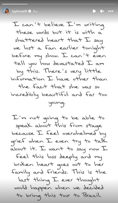 Η Τέιλορ Σουίφτ δεν κατάλαβε τι συνέβη κατά τη διάρκεια της συναυλίας. Ωστόσο, έκανε μια ανακοίνωση μέσω story στο Instagram για να εκφράσει την οδύνη της για τον θάνατο της 23χρονης και να απευθύνει τα συλλυπητήριά της στην οικογένειά της.