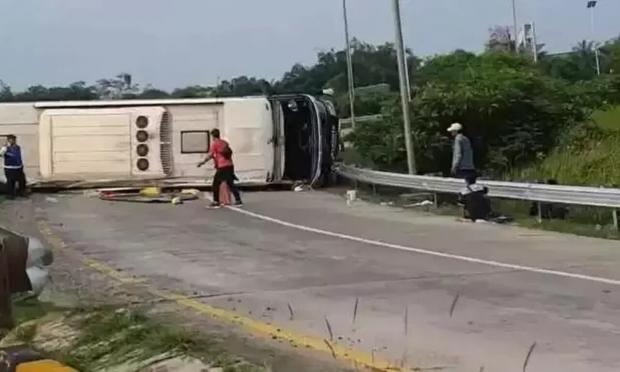 Ο οδηγός έχασε τον έλεγχο του λεωφορείου σε μια απότομη στροφή, προσέκρουσε σε προστατευτική μπαριέρα και ανετράπη, λίγα χιλιόμετρα μακριά από την πόλη Περουακάρτα στην Ινδονησία.