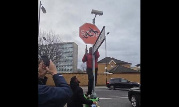 Ωστόσο σε βίντεο που κοινοποιήθηκε στα μέσα κοινωνικής δικτύωσης, έχουν καταγραφεί δύο άνδρες να κατεβάζουν την πινακίδα στη διασταύρωση Southampton Way και Commercial Way στο Peckham περίπου στις 12.30 μ.μ.