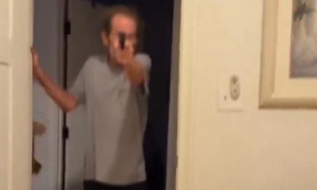 Στο βίντεο που προκαλεί σοκ ακούγεται ο Γουέστ ακούγεται να φωνάζει στον 24χρονο πριν εμφανιστεί στην πόρτα της κρεβατοκάμαράς του κρατώντας ένα πιστόλι.