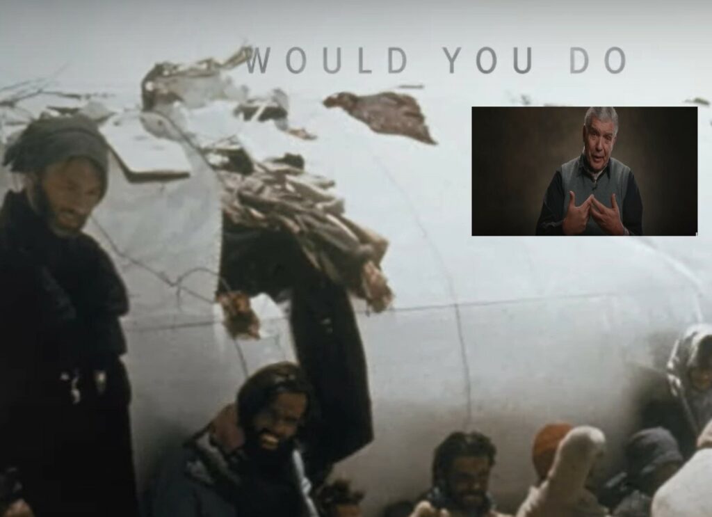 Οι δύσκολοι καιρού απαιτούν δύσκολες αποφάσεις και ο ίδιος συνειδητοποίησε πως όλοι είχαν την ίδια ιδέα, αλλά δεν έλεγαν τίποτα. Και αυτή ήταν να φάνε τη σάρκα των συνεπιβατών τους που δεν είχαν επιζήσει.