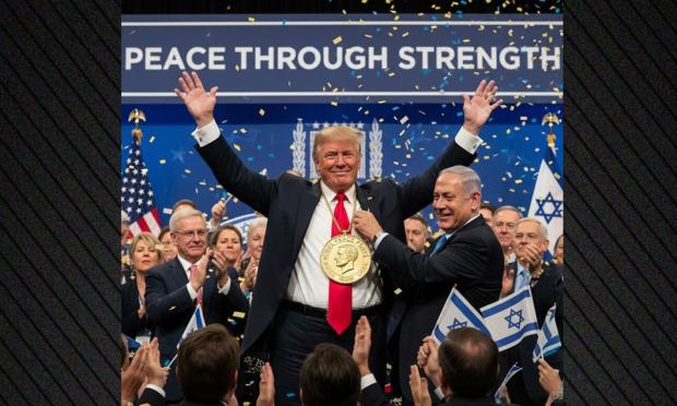 Σε αυτή φαίνεται ο Ισραηλινός πρωθυπουργός να φοράει στον Αμερικανό πρόεδρο ένα τεράστιο μετάλλιο που παραπέμπει στο Νόμπελ Ειρήνης, την ώρα που ο Τραμπ αποθεώνεται και υψώνει τα χέρια του.