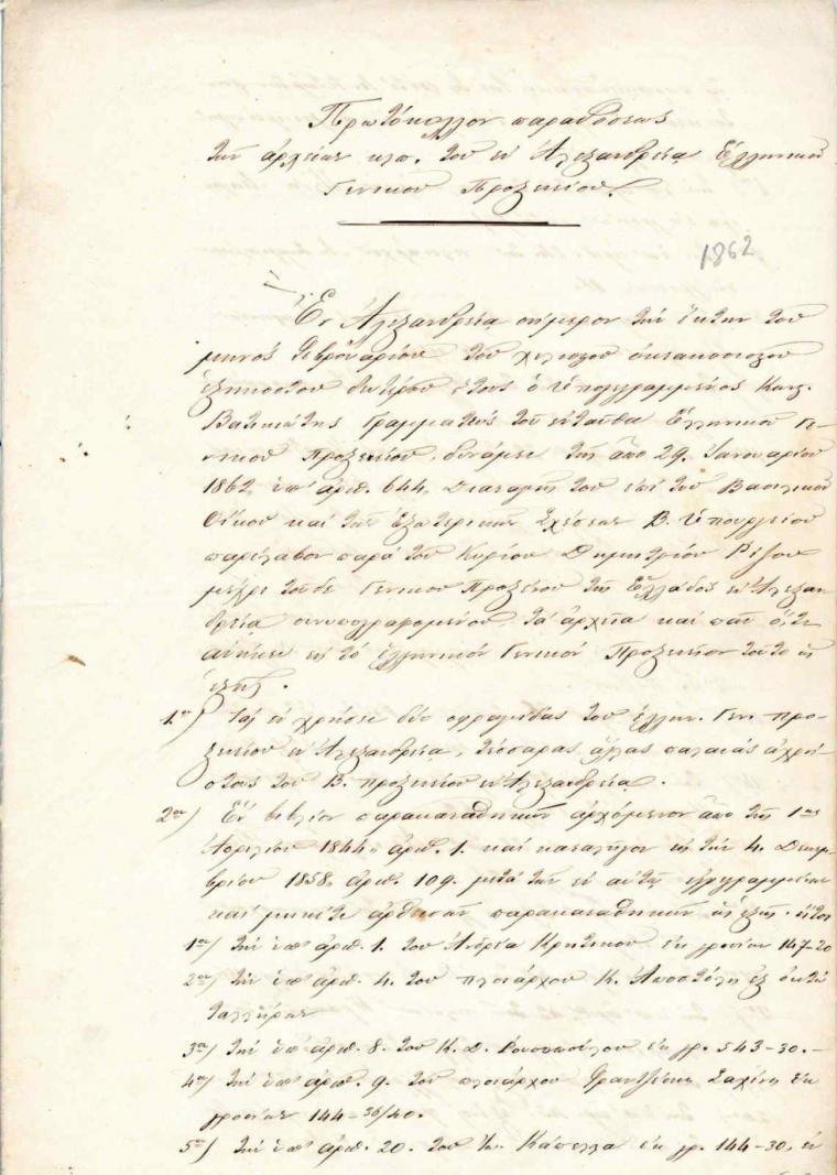 «Με τη σφραγίδα της υψηλής μου Αυτοκρατορικής Μεγαλειότητας, του υψηλοφώνου, ένδοξου και ουρανίου Οίκου των Σουλτάνων, και την κατακυρωμένη αυτοκρατορική μου υπογραφή, εκδίδεται η παρούσα διαταγή», ξεκινά το φιρμάνι για να συνεχίσει λίγες παραγράφους μετά, αναφερόμενος στον διορισμό του Δημητράκη Ρίζου Νερουλού: «Διατάσσω ώστε: Ο εν λόγω πρόξενος, αν και δεν είναι υπήκοος της Αυτοκρατορίας μου αλλά πραγματικός υπήκοος του Βασιλείου της Ελλάδος, θα υπηρετεί στην Αλεξάνδρεια ως Πρόξενος. Θα επιβλέπει τις εμπορικές υποθέσεις και τα συμφέροντα των Ελλήνων υπηκόων και εμπόρων που μεταβαίνουν προς και από την περιοχή αυτή. Σε περιπτώσεις νομικών και εμπορικών διαφορών μεταξύ Ελλήνων υπηκόων, αυτός θα είναι ο επιληφθείς αρμόδιος. Εάν ανακύψουν διαφορές ή εγκλήματα μεταξύ Ελλήνων υπηκόων και υπηκόων της Αυτοκρατορίας μου, οι υποθέσεις αυτές θα εξετάζονται και θα διευθετούνται σύμφωνα με τις συνθήκες και τις ισχύουσες διατάξεις, όπως εφαρμόζεται για τις άλλες φιλικές δυνάμεις. Οι εγκληματικές πράξεις θα τιμωρούνται όπως προβλέπεται από τους ισχύοντες νόμους», αναφέρει μεταξύ άλλων.