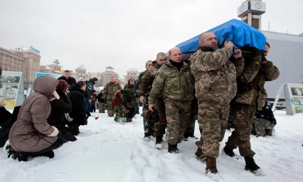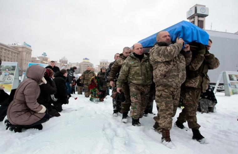 Άνθρωποι, μεταξύ των οποίων στρατιωτικοί και πολίτες, στέκονται και γονατίζουν καθώς οι Ουκρανοί στρατιώτες μεταφέρουν το φέρετρο με τη σορό του λοχαγού της αστυνομίας Oleksandr Ilnitsky, ο οποίος πυροβολήθηκε από φιλορώσο ελεύθερο σκοπευτή στην πληγείσα από την πολεμική σύγκρουση περιοχή του Ντονέτσκ, κατά τη διάρκεια τελετής μνήμης στην πλατεία Ανεξαρτησίας στο Κίεβο της Ουκρανίας, τη Δευτέρα 11 Ιανουαρίου 2016. Ο Ιλνίτσκι σκοτώθηκε στις 9 Ιανουαρίου καθώς διέσωζε άμαχους κατοίκους από τα πυρά φιλορώσων αυτονομιστών.