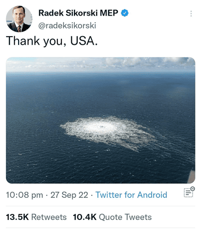 Μέσα σε αυτό το πλαίσιο, δεν είναι ασήμαντο να αναφέρουμε ότι ο Σικόρσκι είναι Βρετανός πράκτορας και στενός προσωπικός φίλος του Μπόρις Τζόνσον. Ο επικεφαλής του Σικόρσκι, Ντόναλντ Τουσκ, έφτασε ακόμη και στο σημείο να δηλώσει στο X ότι όλοι οι «ρωσικοί στόχοι» στην ΕΕ είναι νόμιμοι. Είναι σχεδόν σαν να γνώριζαν το τι θα συμβεί μετά μερικές ημέρες…