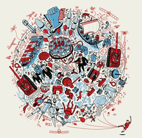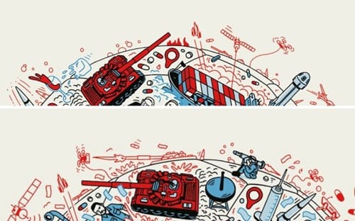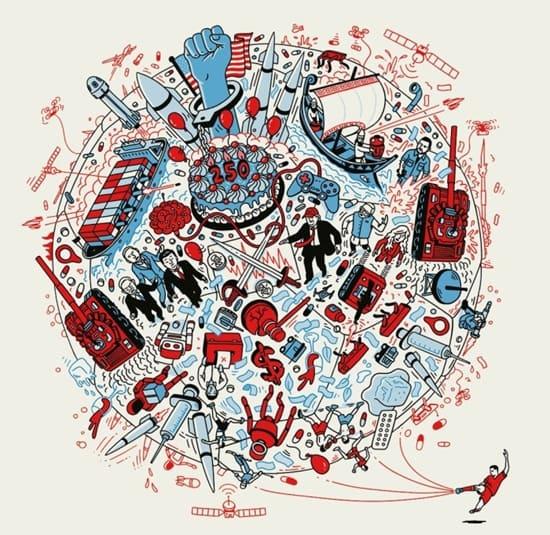 2) Πύραυλοι, ρομπότ και σύριγγες είναι κυριολεκτικά διάσπαρτα στην εικόνα. Πιθανότατα, ο κόσμος θα υπολογίσει σύντομα πόσα από το καθένα και πού – οι αριθμοί είναι σίγουρα συμβολικοί και υποδηλώνουν ημερομηνίες.