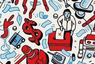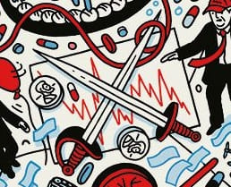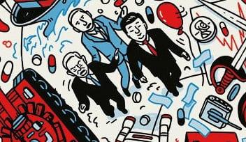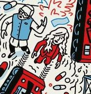 3) Χάπια – υπάρχουν και είναι αρκετά. Για την ακρίβεια, δεν είναι χάπια, αλλά κάψουλες, τα μισά κόκκινα και τα άλλα μισά μπλε/άσπρα. Αυτό μπορεί να είναι μια νύξη-αναφορά στο Matrix, ή ίσως τα χάπια είναι απλώς μέρος του συνολικού χρωματικού συνδυασμού του κόκκινου και του μπλε, υποδηλώνοντας τις πολιτικές διαιρέσεις ολόκληρης της κοινωνίας.