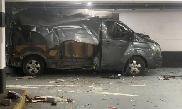 Φωτογραφίες από το σημείο δείχνουν το βαν σχεδόν κατεστραμμένο, με σπασμένα παράθυρα και εκτεθειμένο το εσωτερικό του.