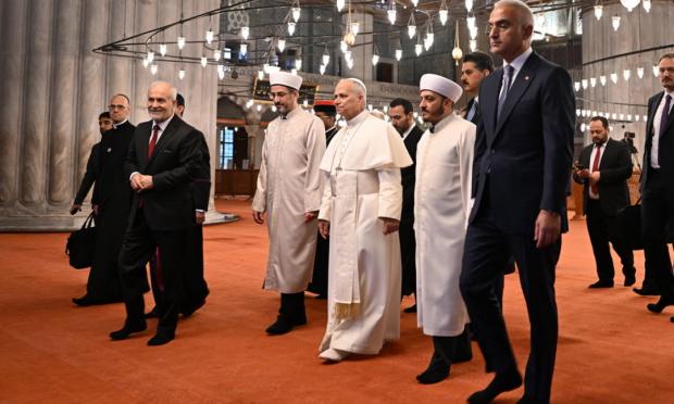 Ο Πάπας Λέων επισκέφθηκε σήμερα το φημισμένο Μπλε Τζαμί της Κωνσταντινούπολης, βγάζοντας τα παπούτσια του σε ένδειξη σεβασμού, αλλά χωρίς να φανεί να προσεύχεται κατά την πρώτη επίσκεψή του ως ηγέτη της Ρωμαιοκαθολικής Εκκλησίας σε ένα μουσουλμανικό χώρο λατρείας στη διάρκεια της τετραήμερης παραμονής του στην Τουρκία.