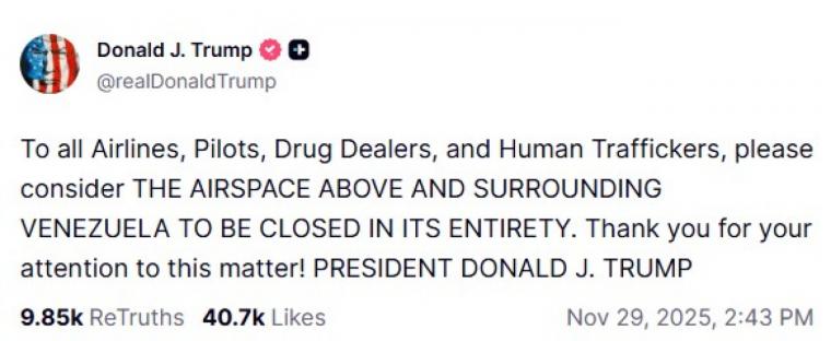 Σε μια κίνηση που αιφνιδίασε τη διεθνή κοινότητα, αλλά και το εσωτερικό των ΗΠΑ, ο Πρόεδρος Ντόναλντ Τραμπ προχώρησε σε ευθεία κλιμάκωση κατά του Καράκας. Με ανάρτησή του στην πλατφόρμα Truth Social το Σάββατο (29/11), ανακοίνωσε ότι ο εναέριος χώρος πάνω και γύρω από τη Βενεζουέλα πρέπει να θεωρείται πλέον πλήρως κλειστός, απευθύνοντας αυστηρή προειδοποίηση προς «όλες τις αεροπορικές εταιρείες, τους πιλότους, τους εμπόρους ναρκωτικών και τους διακινητές ανθρώπων».