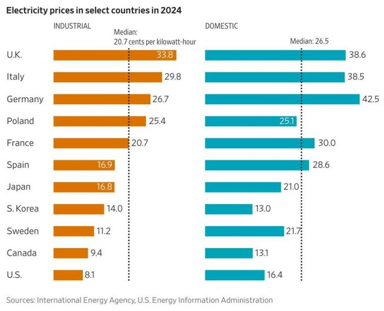 Η Γερμανία έχει πλέον τις υψηλότερες εγχώριες τιμές ηλεκτρικής ενέργειας στον ανεπτυγμένο κόσμο, ενώ το Ηνωμένο Βασίλειο έχει τις υψηλότερες τιμές ηλεκτρικής ενέργειας για βιομηχανικές επιχειρήσεις, σύμφωνα με ανάλυση 28 μεγάλων οικονομιών από τον Διεθνή Οργανισμό Ενέργειας. Η Ιταλία δεν απέχει και πολύ. Οι μέσες τιμές ηλεκτρικής ενέργειας για τη βαριά βιομηχανία στην Ευρωπαϊκή Ένωση εξακολουθούν να είναι περίπου διπλάσιες από ό,τι στις ΗΠΑ και 50% υψηλότερες από από αυτές της Κίνας.
