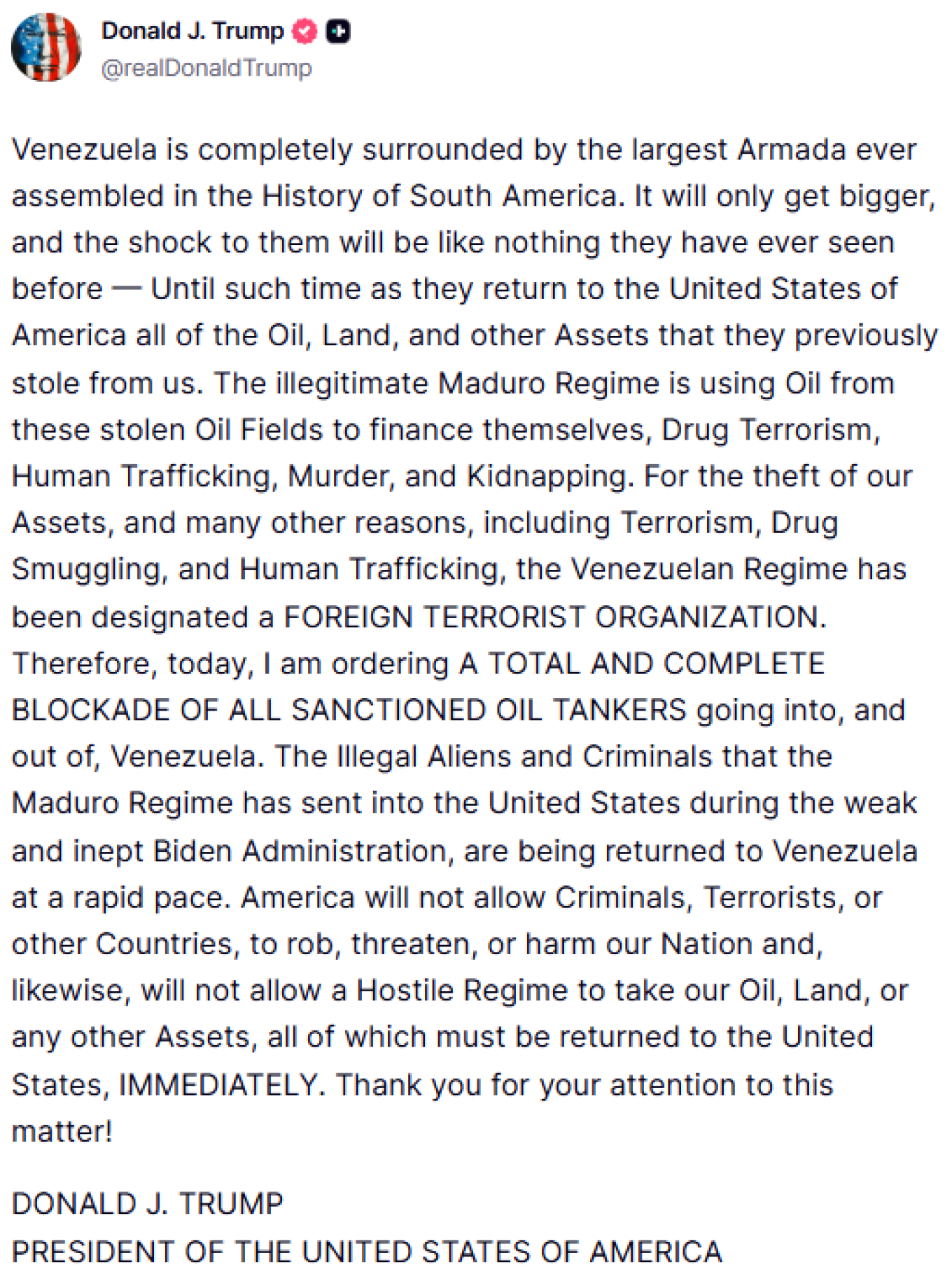 Σε δήλωσή του, ο Ντόναλντ Τραμπ ανέφερε ότι η Βενεζουέλα βρίσκεται «πλήρως περικυκλωμένη» από μια άνευ προηγουμένου στρατιωτική ναυτική δύναμη, η οποία, όπως σημείωσε, «θα συνεχίσει να μεγαλώνει». Σύμφωνα με τον ίδιο, η πίεση που θα ασκηθεί στο Καράκας θα είναι τέτοια «που δεν έχει ξαναζήσει ποτέ», έως ότου επιστραφούν στις Ηνωμένες Πολιτείες «όλο το πετρέλαιο, η γη και τα περιουσιακά στοιχεία» που, όπως υποστηρίζει, έχουν αφαιρεθεί παράνομα από αμερικανικά συμφέροντα.