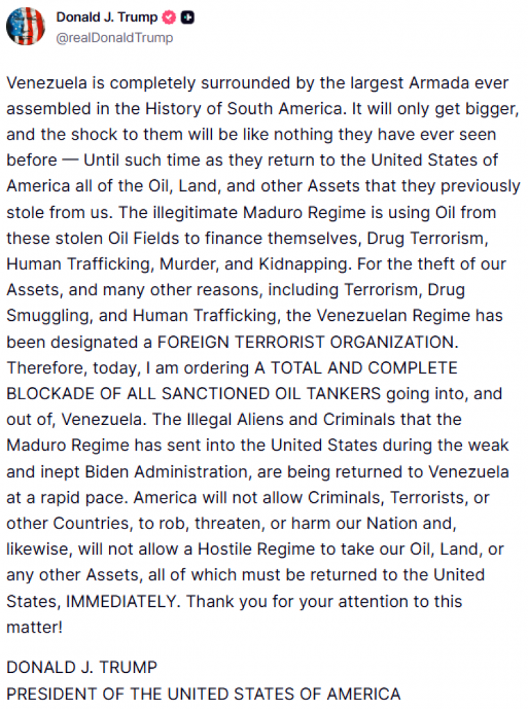 Στο πλαίσιο αυτό, ο Ντόναλντ Τραμπ ανακοίνωσε ότι δίνει εντολή για «ολικό και πλήρη αποκλεισμό όλων των πετρελαιοφόρων που τελούν υπό καθεστώς κυρώσεων», τόσο κατά την είσοδο όσο και κατά την έξοδο από τη Βενεζουέλα. Δεν παρείχε, ωστόσο, περισσότερες λεπτομέρειες σχετικά με τον τρόπο εφαρμογής ή τη χρονική διάρκεια του μέτρου.
