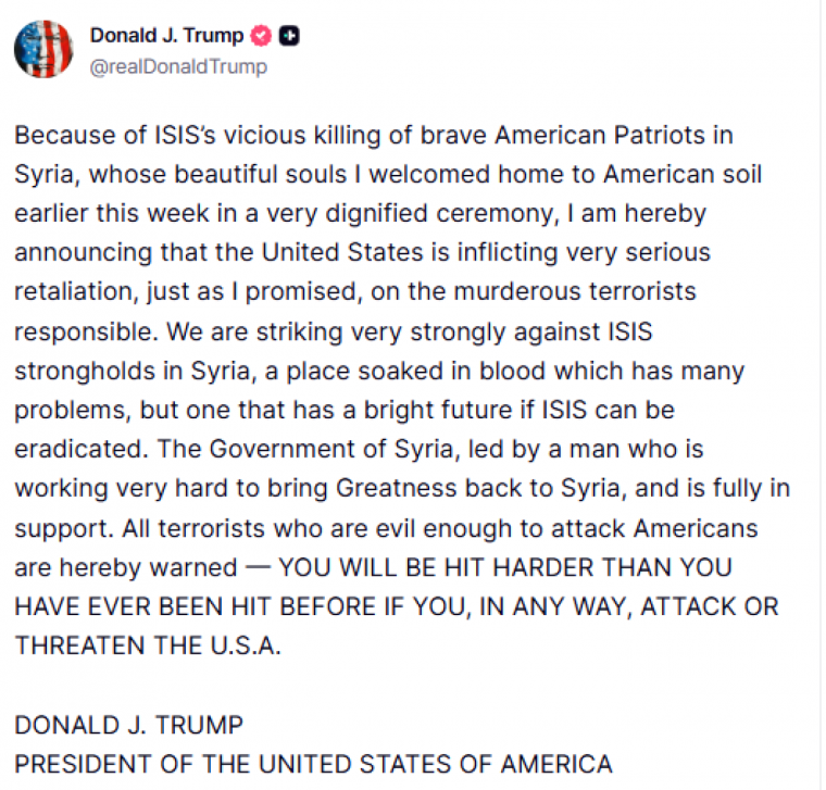 Ο Αμερικανός πρόεδρος Ντόναλντ Τραμπ γνωστοποίησε μέσω της πλατφόρμας Truth Social ότι βρίσκονται σε εξέλιξη «πολύ βαριά αντίποινα», αναφερόμενος στις στρατιωτικές επιχειρήσεις των ΗΠΑ στη Συρία εναντίον της τζιχαντιστικής οργάνωσης Ισλαμικό Κράτος (ISIS). Η ανακοίνωση ήρθε σχεδόν μία εβδομάδα μετά την επίθεση που κόστισε τη ζωή σε δύο μέλη των αμερικανικών ενόπλων δυνάμεων και έναν διερμηνέα.