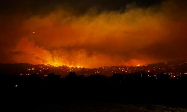 Φωτογραφίες που τραβήχτηκαν στην αρχή της εβδομάδας δείχνουν τον νυχτερινό ουρανό βαμμένο πορτοκαλί και φλόγες να κατατρώνε θαμνώδη περιοχή.