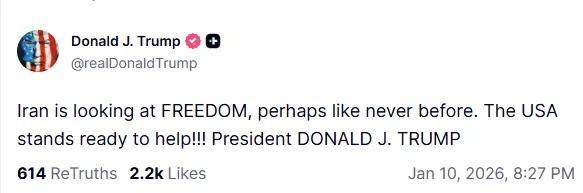 Σε ανάρτησή του στα μέσα κοινωνικής δικτύωσης, ο Ντόναλντ Τραμπ δήλωσε χθες ότι το Ιράν «στρέφεται προς την ελευθερία, ίσως περισσότερο από ποτέ», επισημαίνοντας παράλληλα ότι οι Ηνωμένες Πολιτείες είναι έτοιμες να προσφέρουν βοήθεια. Οι δηλώσεις αυτές εντάσσονται στο πλαίσιο της αυξανόμενης πίεσης προς την ιρανική ηγεσία.