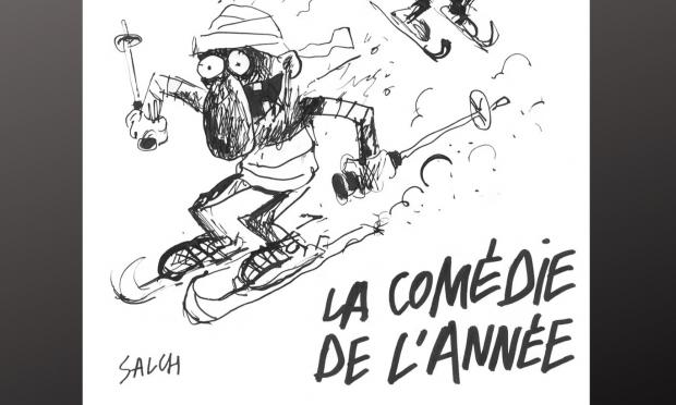 Στο σκίτσο, δύο σκιέρ με επιδέσμους και καμένο δέρμα κατεβαίνουν μια πλαγιά, με φόντο ένα πανό όπου αναγράφεται «Κραν Μοντανά», ο τίτλος της (υποτιθέμενης) ταινίας «Οι καμένοι κάνουν σκι» και η επεξήγηση «Η κωμωδία της χρονιάς». Οι δύο τελευταίες φράσεις παραπέμπουν στην ταινία του 1979 «Οι μαυρισμένοι κάνουν σκι» (“Les Bronzés font du ski”, ελληνικός τίτλος «Ξένοιαστες διακοπές»).