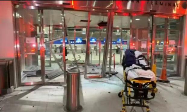 Ένα φορείο έχει τοποθετηθεί μπροστά από το σημείο όπου το αυτοκίνητο διέσπασε την είσοδο του terminal, ξηλώνοντας τις πόρτες από τους μεντεσέδες και σκορπίζοντας θραύσματα γυαλιού σε όλο τον χώρο