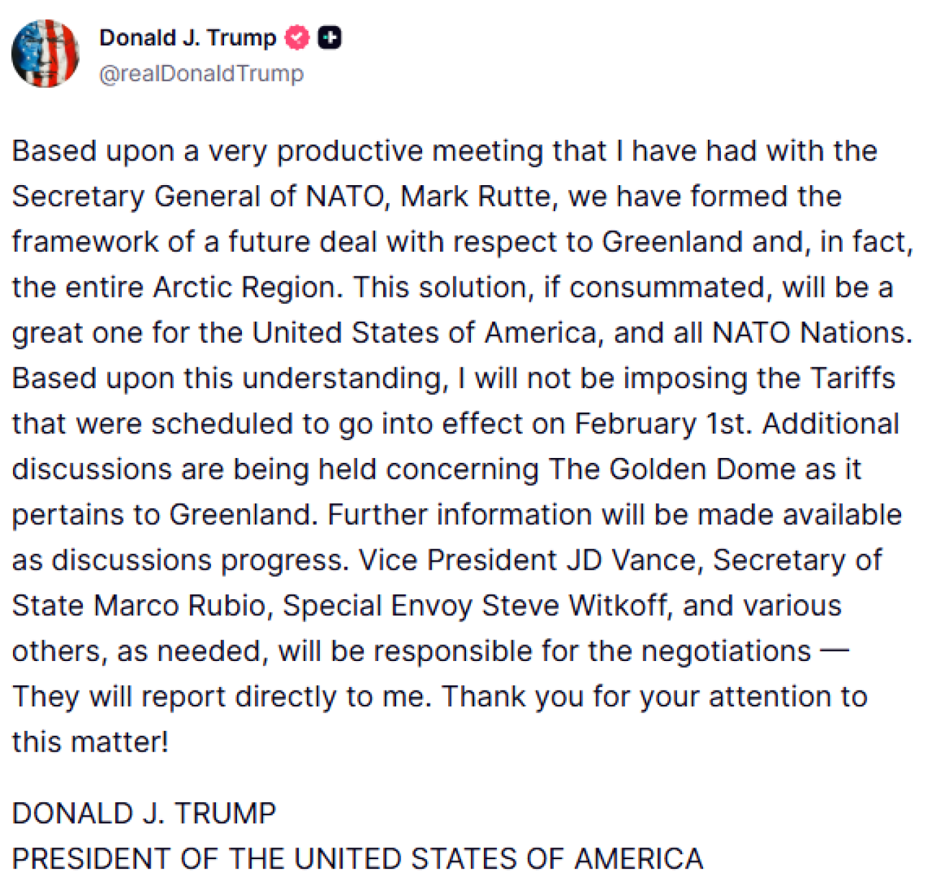 Ο Τραμπ, αφού αναστάτωσε τις παγκόσμιες αγορές με την απειλή επιβολής δασμών σε οκτώ ευρωπαϊκές χώρες που διαφωνούσαν με την ιδέα του για προσάρτηση της Γροιλανδίας, που προκάλεσε την ανταπόδοση της απειλής από τους Ευρωπαίους με την επιστράτευση του «μπαζούκα» των κυρώσεων εις βάρος των ΗΠΑ, και αφού υπονόμευσε πλήρως τη Δυτική Συμμαχία, αποφάσισε, μετά από μια συζήτηση με τον γ.γ. του ΝΑΤΟ Μαρκ Ρούτε, να κηρύξει το τέλος του συναγερμού που ο ίδιος προκάλεσε και να ανακαλέσει την απόφασή του για κυρώσεις εναντίον των ευρωπαϊκών χωρών.