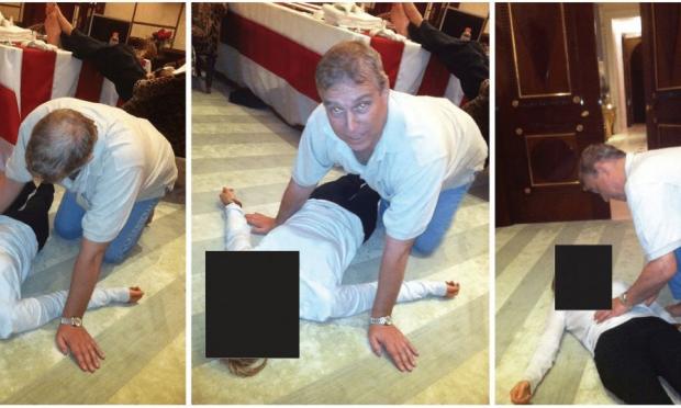 Ο Άντριου Μαουντμπάτεν-Γουίντσορ σκυμμένος πάνω από μια άγνωστη γυναίκα, κάτι που δόθηκε στη δημοσιότητα στην τελευταία αποκάλυψη αρχείων που συνδέονται με τον Τζέφρι Έπσταϊν