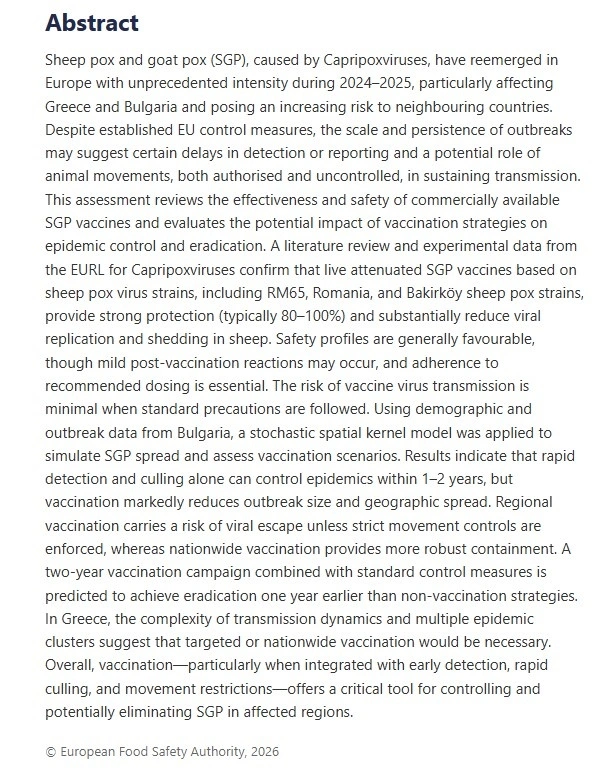 «Η παρούσα αξιολόγηση εξετάζει την αποτελεσματικότητα και την ασφάλεια των εμβολίων SGP που διατίθενται στο εμπόριο και αξιολογεί τον πιθανό αντίκτυπο των στρατηγικών εμβολιασμού στον έλεγχο και την εξάλειψη της επιδημίας. Μια βιβλιογραφική ανασκόπηση και πειραματικά δεδομένα από το EURL για τους ιούς Capripoxvirus επιβεβαιώνουν ότι τα ζωντανά εξασθενημένα εμβόλια SGP που βασίζονται σε στελέχη του ιού της ευλογιάς των προβάτων, συμπεριλαμβανομένων των στελεχών RM65, Romania και Bakirköy, παρέχουν ισχυρή προστασία (συνήθως 80-100%) και μειώνουν σημαντικά την αναπαραγωγή και την εξάπλωση του ιού στα πρόβατα. Τα προφίλ ασφάλειας είναι γενικά ευνοϊκά, αν και ενδέχεται να εμφανιστούν ήπιες αντιδράσεις μετά τον εμβολιασμό, και η τήρηση της συνιστώμενης δοσολογίας είναι απαραίτητη. Ο κίνδυνος μετάδοσης του ιού του εμβολίου είναι ελάχιστος όταν τηρούνται οι συνήθεις προφυλάξεις», τονίζεται στη μελέτη.