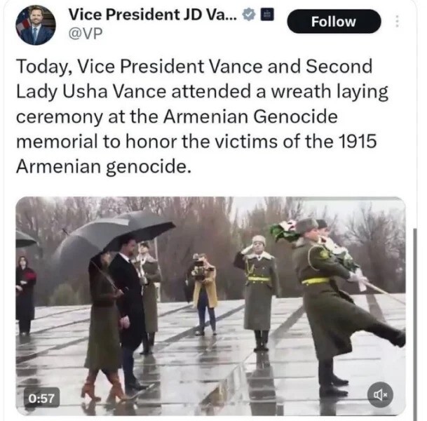 Αναλυτικά, η ανάρτηση ανέφερε: «Σήμερα ο αντιπρόεδρος Βανς και η δεύτερη κυρία Ούσα Βανς παρέστησαν σε κατάθεση στεφάνου στο μνημείο της Αρμενικής Γενοκτονίας για να τιμήσουν τα θύματα της γενοκτονίας των Αρμενίων το 1915».
