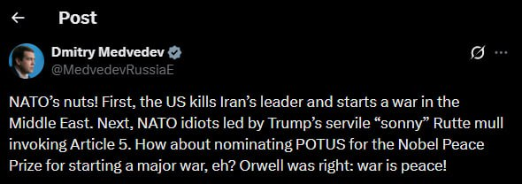 «Το ΝΑΤΟ είναι τρελό! Πρώτα, οι ΗΠΑ σκοτώνουν τον ηγέτη του Ιράν και ξεκινούν πόλεμο στη Μέση Ανατολή. Στη συνέχεια, οι ηλίθιοι του ΝΑΤΟ, με επικεφαλής τον δουλοπρεπή "γιόκα" του Τραμπ, Ρούτε, σκέφτονται να επικαλεστούν το Άρθρο 5. Τι θα λέγατε να προτείνετε τον Πρόεδρο των ΗΠΑ για το Νόμπελ Ειρήνης επειδή ξεκίνησε έναν μεγάλο πόλεμο; Ο Όργουελ είχε δίκιο: ο πόλεμος είναι ειρήνη!» αναφέρει χαρακτηριστικά.