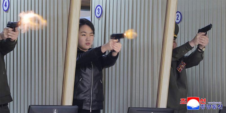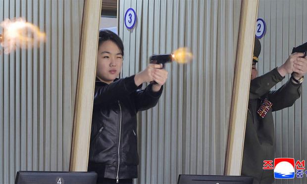 Φωτογραφία της έφηβης κόρης του ηγέτη της Βόρειας Κορέας, Κιμ Γιονγκ Ουν, να πυροβολεί με πιστόλι έδωσαν στη δημοσιότητα τα κρατικά μέσα ενημέρωσης της χώρας την Πέμπτη 12 Μαρτίου, αναζωπυρώνοντας τα σενάρια ότι προορίζεται για διάδοχός του.