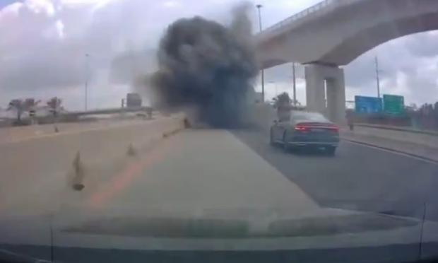 Στο βίντεο φαίνεται ένα κομμάτι από τον διαλυμένο πύραυλο να πέφτει ξαφνικά στον δρόμο, σηκώνοντας πυκνό καπνό, καθώς το όχημα που καταγράφει το περιστατικό περνάει από το σημείο. Ένα άλλο όχημα που κινούνταν παράλληλα, πρόλαβε κι έκανε έναν ελιγμό για να απομακρυνθεί και να συνεχίσει την πορεία του.