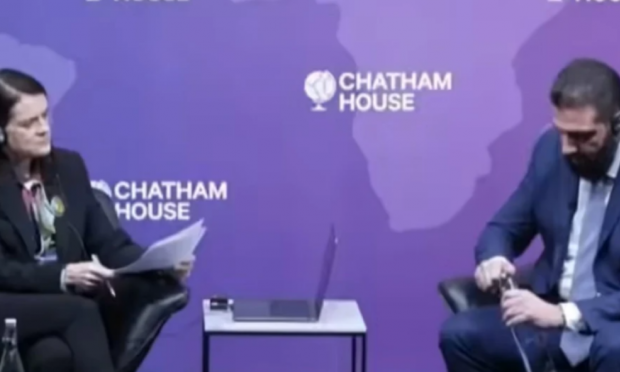 Η δημοσιογράφος Μπρόνουεν Μάντοχ, διευθύντρια του Chatham House, ευγενικά, προσέφερε βοήθεια για να ανοίξει το μπουκάλι, δημιουργώντας μια αμήχανη στιγμή.
