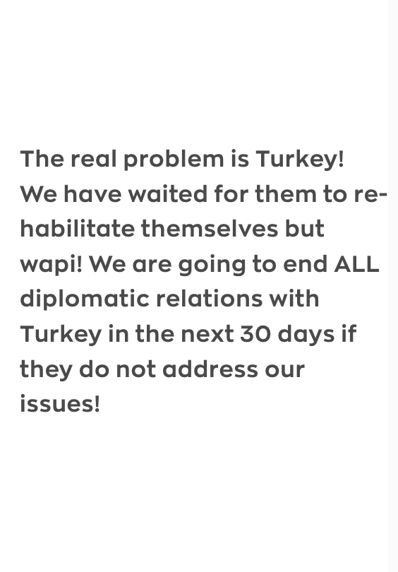 Στη συνέχεια της ανάρτησής του, ο αρχηγός του στρατού ξεκαθάρισε τις προθέσεις του, δηλώνοντας ότι η χώρα του θα προχωρήσει στη διακοπή όλων των διπλωματικών σχέσεων με την Τουρκία μέσα στις επόμενες 30 ημέρες, εάν δεν αντιμετωπιστούν τα ζητήματα που έχουν προκύψει.