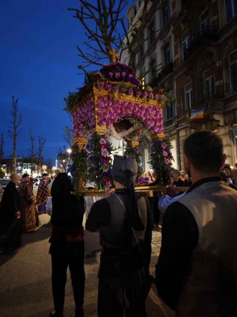 Στη συνέχεια έγινε η Περιφορά του όμορφα στολισμένου Επιταφίου στους δρόμους των Βρυξελλών, με τα μέλη του Συλλόγου Θρακιωτών Βρυξελλών ντυμένα με τις παραδοσιακές μας φορεσιές να τον μεταφέρουν και να τον συνοδεύουν.