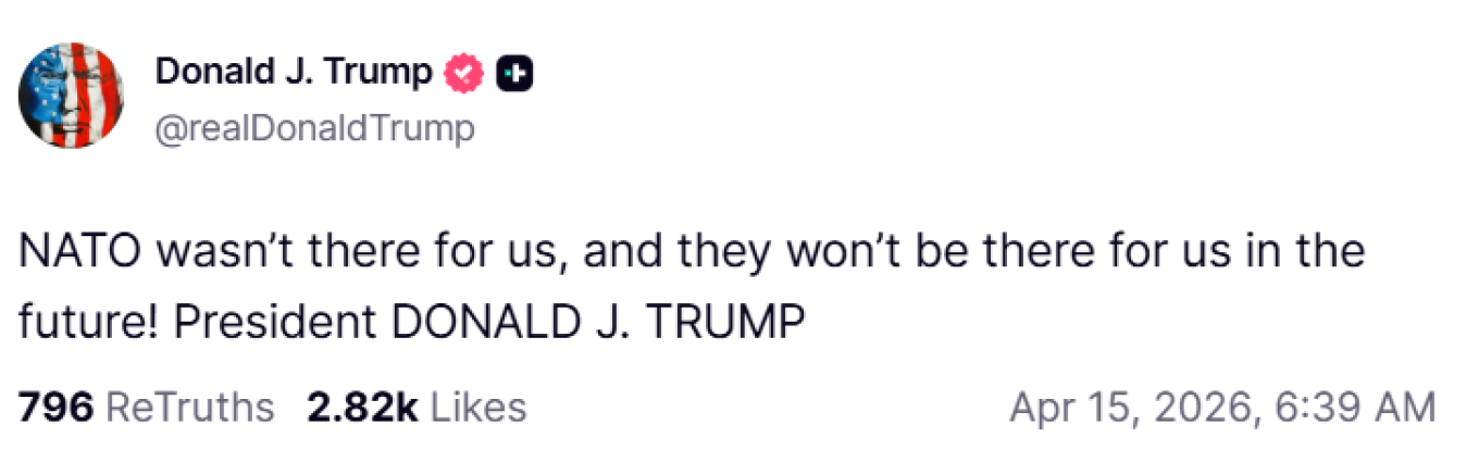 «Το ΝΑΤΟ δεν ήταν εκεί για εμάς και δεν θα είναι εκεί στο μέλλον. Πρόεδρος Τραμπ».