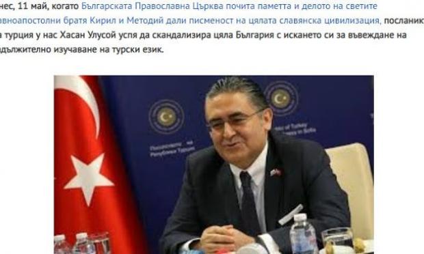 «Σήμερα 11 Μαΐου, που η Βουλγαρική Ορθόδοξη Εκκλησία τιμά τη μνήμη και το έργο των Αγίων ισαποστόλων αδελφών Κυρίλλου και Μεθοδίου και τη γραφή ολόκληρου του σλαβικού πολιτισμού, ο πρέσβης της Τουρκίας στη Βουλγαρία, Χασάν Ουλουσόι, κατάφερε να σκανδαλίσει ολόκληρη τη Βουλγαρία με το αίτημά του να εισαχθεί η υποχρεωτική εκμάθησης της τουρκικής γλώσσας», γράφει το βουλγαρικό δημοσίευμα.